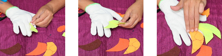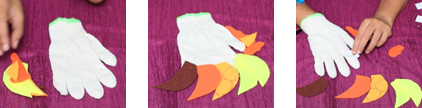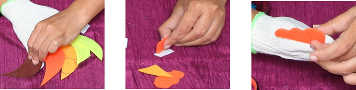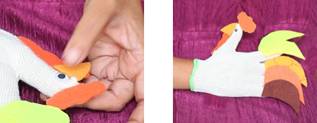 - Turn the glove so that the thumb is on the side (used for the rooster’s head).